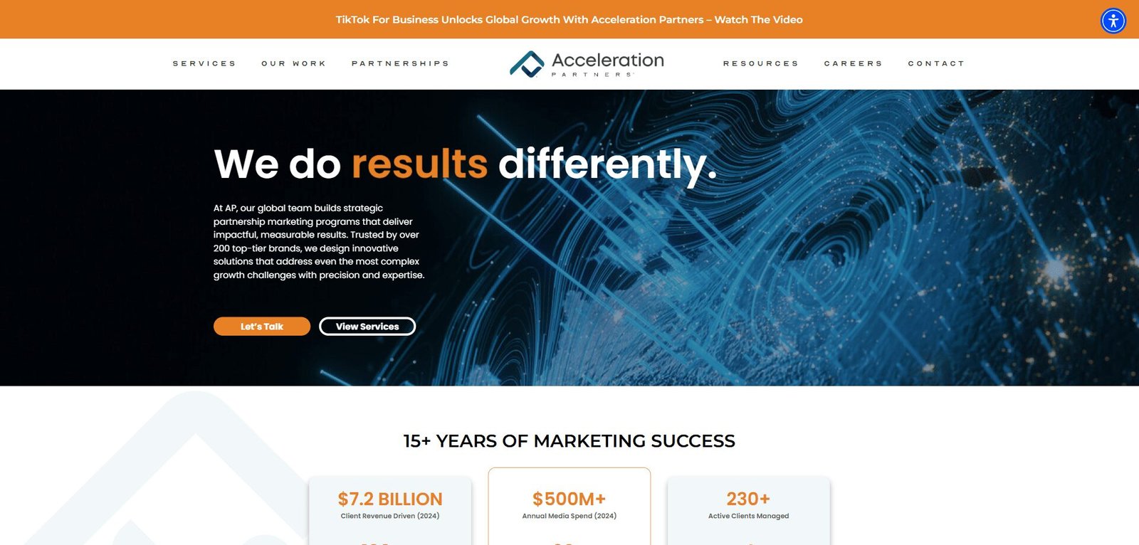 We rebuilt the Acceleration Partners website to better reflect their leadership in global partnership marketing. The project focused on improving site performance, scalability, and lead generation across multiple regions.